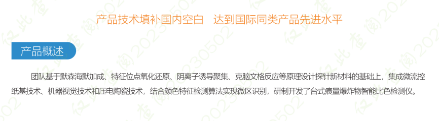 團隊基(jī)於(yú)默森海默加成、特征位點(diǎn)氧化還原、陰離子誘(yòu)導聚集、克腦文格反應等原理設計探針新材料(liào)的(de)基礎上,集成微流控紙基技(jì)術、機器視覺技術和壓電陶瓷技術,結合顏色特征(zhēng)檢測算法實現微區識別,研(yán)製開發了台式痕量爆炸物智能比(bǐ)色檢測儀。